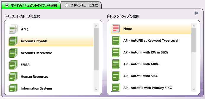 [すべてのドキュメントタイプから選択] - このタブ/ラジオボタンが選択されている場合、使用可能なドキュメントグループが [ドキュメントグループの選択] ボックスに表示されます。ドキュメントグループは、OnBaseでは類似するドキュメントタイプをまとめるために使用され、通常、組織単位や組織内の部門に関連付けられます。