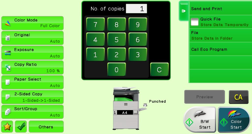 - Select the number of copies by entering the number on the keypad, and select copy settings by tapping the available options. Then press Start on the device panel or the Start button on the screen to start copying