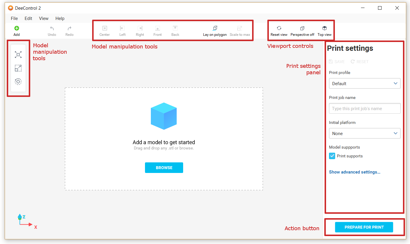 DeeControl 2 is a visual editor for 3D models. Its main features are preparing a model for 3D printing and sending the print job to an eDee printer via Dispatcher Paragon.