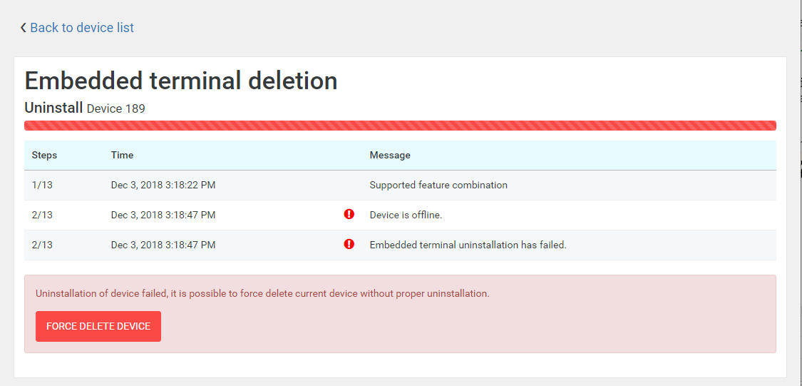 - From the Embedded terminal deletion progress page by clicking the "FORCE DELETE DEVICE" button.