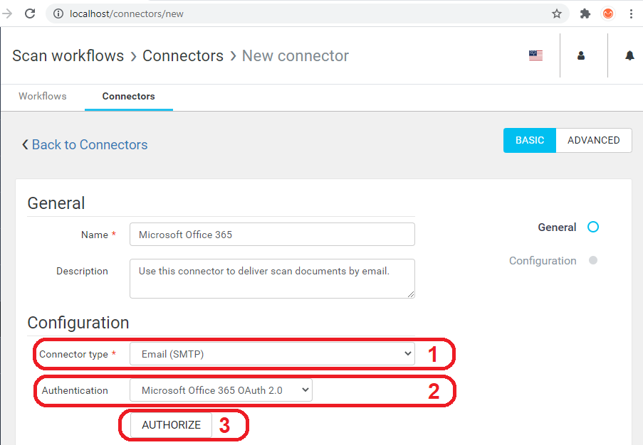 Use the Email (SMTP) type connector to deliver scanned files over email using an SMTP server. You can configure the SMTP server using the system settings in Management or through Microsoft 365 OAuth 2.0.