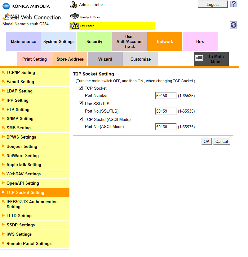 - Turn the main switch OFF and then ON again to apply changes to TCP Socket settings.