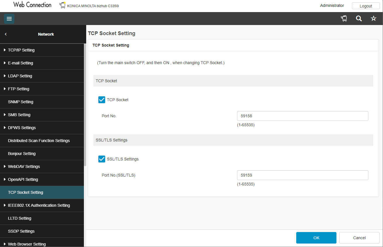 Turn the main switch OFF and then ON again to apply changes to TCP Socket settings.