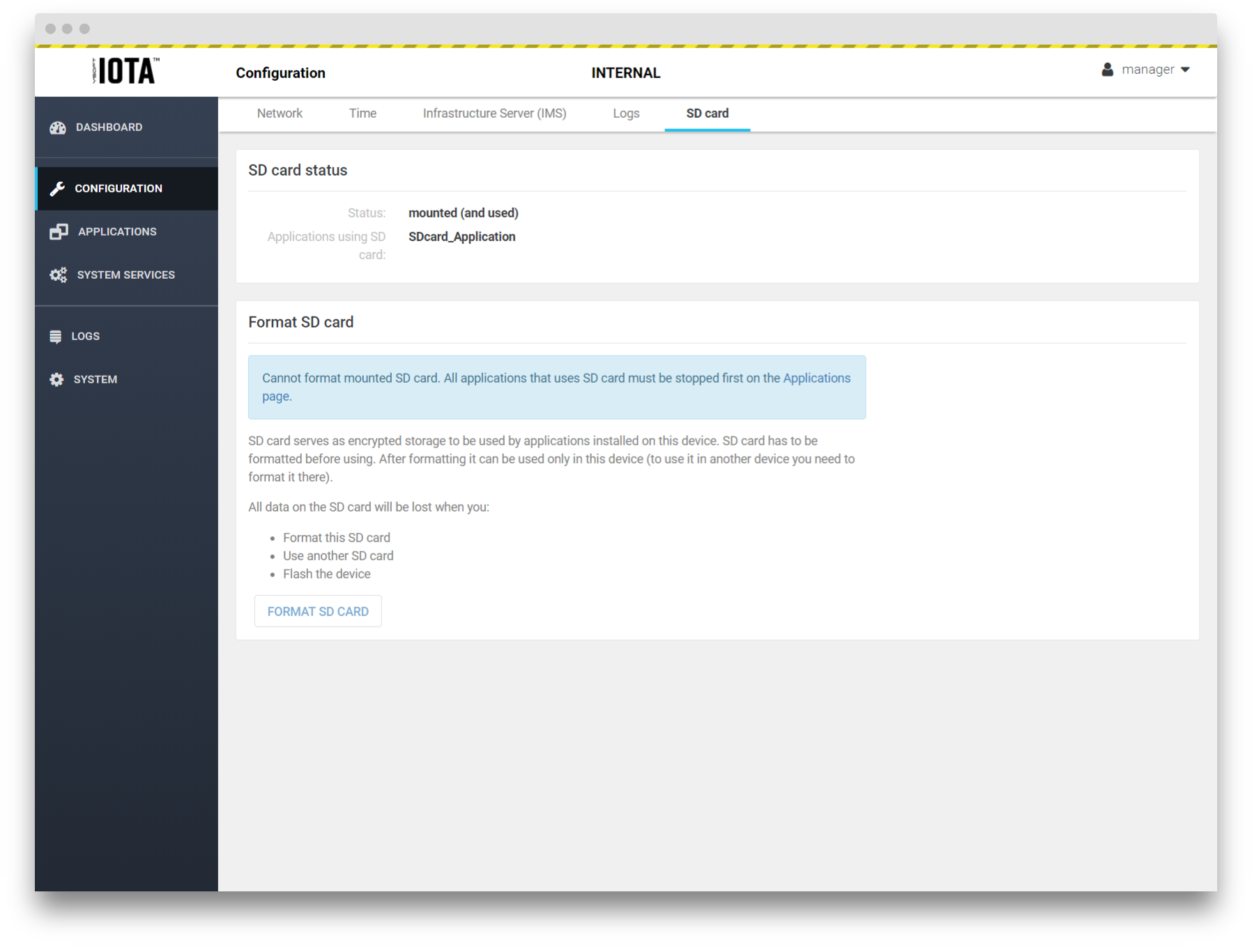 - Go to the Dashboard page. You can see the sdcard storage in right bottom section. The size and usage of SD cards are only shown if there is running application that uses the card.