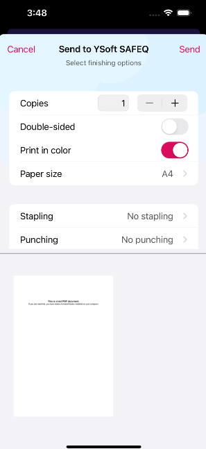 - The user can configure finishing options upon job submission on IOS and Android as follows: