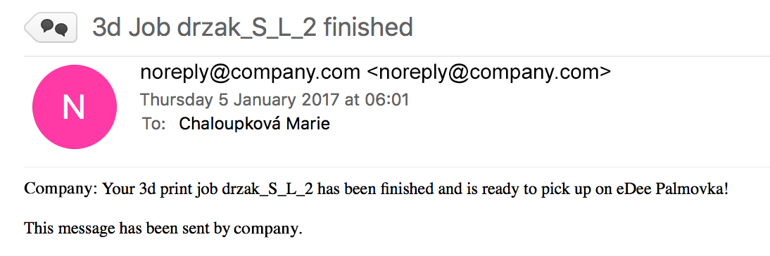 - In case your model print time is longer than 5 hours following message is displayed. If you choose "Send snapshots", you will receive email notification with a photo of your current print progress at 5% and 55%.