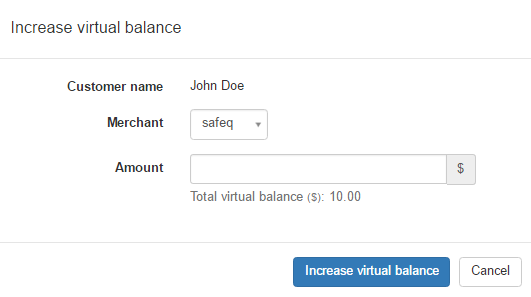- Click Increase virtual balance, the "Increase virtual balance" window appears.