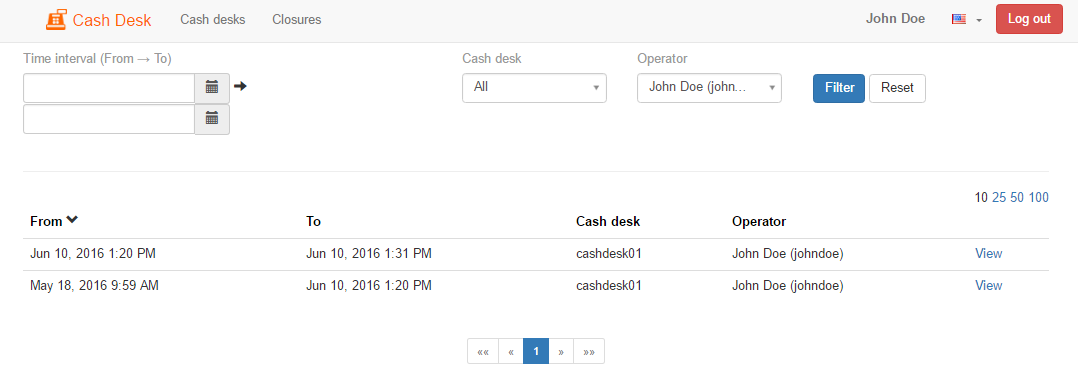 Optionally, filter closures by date and time, by cash desk, or operator, and sort or list pages with closures. To see the details of a certain closure, click View on the right side of the selected line.