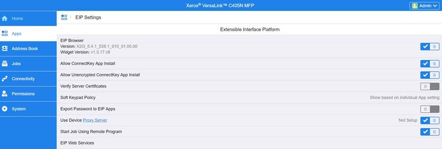 For the older printer models, the option is available in Apps > EIP Settings > EIP Web Services > Job Management Extension.